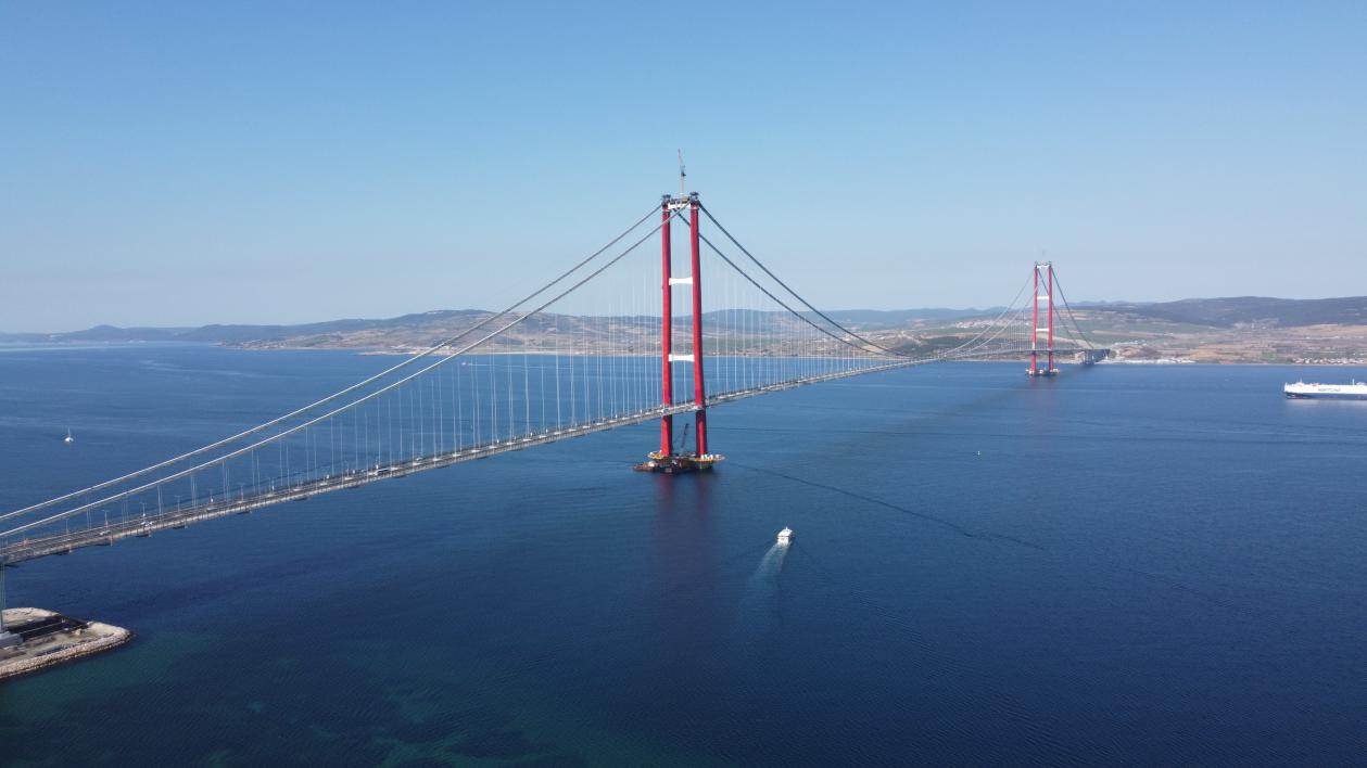 跨越土耳其馬爾馬拉海西端的達(dá)達(dá)尼爾海峽,連接歐亞兩洲,為雙塔三跨懸索橋,雙向六車(chē)道,橋梁主跨長(zhǎng)度2023米,是目前世界上跨徑最大的懸索橋,于2022年3月18日建成通車(chē)。