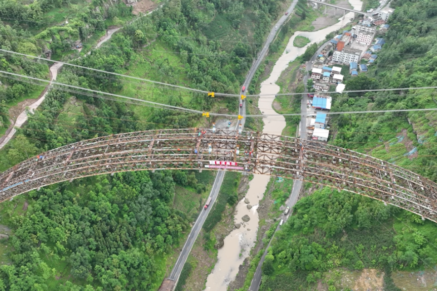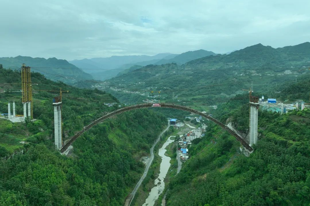 蘇壩特大橋具有“三大”特點(diǎn):一是施工難度大,主橋施工采用無支架纜索吊裝工藝,且施工區(qū)域位于陡崖地段,主橋跨越國道及縣道,施工組織難度大、風(fēng)險(xiǎn)高;二是施工作業(yè)面高,作業(yè)面距河面近300米,相當(dāng)于100層樓的高度,施工期間還面臨山區(qū)極端氣候影響;三是合龍精度高,通過精細(xì)化有限元模型仿真計(jì)算及全過程高精度測量控制,合龍段軸線誤差控制在5毫米以內(nèi),高程控制在7毫米以內(nèi),實(shí)現(xiàn)了勁性骨架高精度合龍。