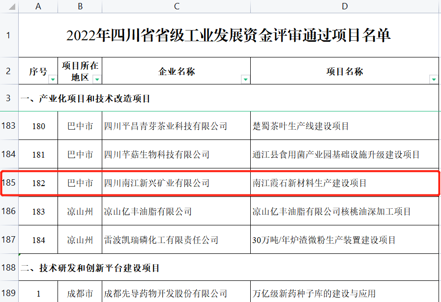 近日,四川省經(jīng)濟(jì)和信息化廳公布了2022年四川省省級(jí)工業(yè)發(fā)展專項(xiàng)資金現(xiàn)場(chǎng)核實(shí)通過(guò)項(xiàng)目的名單,四川路橋新材料集團(tuán)鑫展望公司“南江霞石新材料建設(shè)項(xiàng)目”成功入選,獲得省級(jí)工業(yè)發(fā)展專項(xiàng)資金218萬(wàn)元。