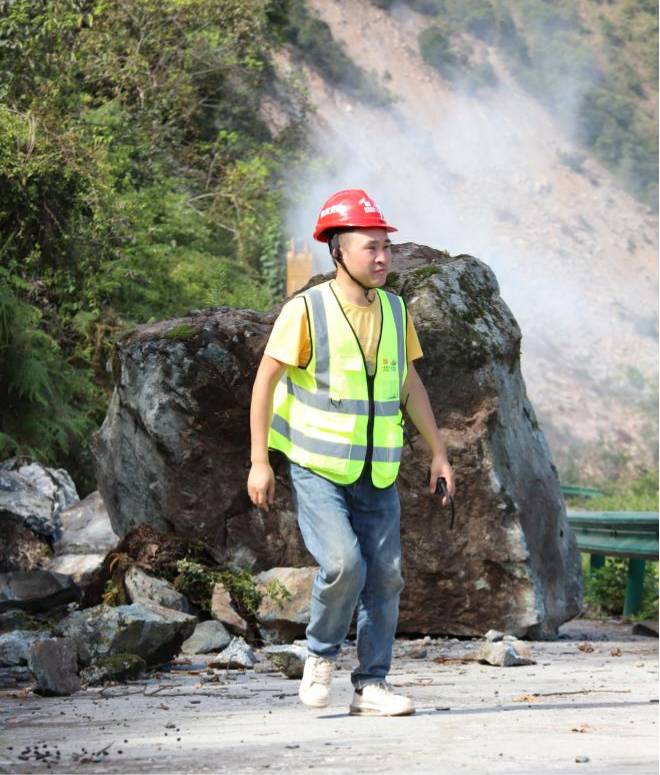 “當(dāng)搶險命令下達的那一刻,我找到了自己的目標(biāo)!”四川路橋交建集團隧道公司瀘石高速TJ9項目部工程科職員李坤宇像箭簇一樣奔赴“戰(zhàn)場”。在桃壩隧道至大崗山隧道懸崖段搶險現(xiàn)場,李坤宇頭頂是滾滾落石,腳下是懸崖,但這絲毫沒有動搖他繼續(xù)向前的決心,他冒著再次塌方的危險指揮機械清理邊坡塌方,為過往車輛觀察放哨,確保救援車輛和人員安全通行?!拔沂悄贻p人,關(guān)鍵時刻就該沖在前面!” 懸崖段道路被打通后,李坤宇又馬不停蹄地轉(zhuǎn)戰(zhàn)幸福村村道搶通工作中,即使上方是高危塌方,下面是懸崖,前方是多處坍塌的路基,李坤宇也從未想過后退,以攻堅克難的銳氣和不畏艱險的勇氣書寫新時代路橋青年員工矢志不渝的初心!