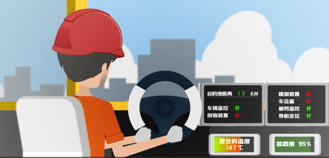 采用節(jié)能環(huán)保的智能環(huán)保運輸車,車廂采用隔離劑自動噴淋裝置,通過減少人工噴淋環(huán)節(jié),實現(xiàn)減少人工、提高施工效率的目的。智能環(huán)保運輸車通過艙蓋關(guān)閉與保溫板的裹覆達到車廂內(nèi)的保溫效果,運輸過程中通過安裝在車廂內(nèi)的溫度檢測裝置,實時監(jiān)控瀝青混凝土溫度,確保攤鋪現(xiàn)場瀝青混合料溫度處于可控范圍內(nèi),監(jiān)控信息實時傳輸至車輛顯示屏及主控屏幕,車廂內(nèi)物料溫度臨近預(yù)設(shè)值,系統(tǒng)會自動預(yù)警(140度),并提醒司機盡快趕到施工現(xiàn)場裝卸物料或采取相應(yīng)措施。如溫度低于預(yù)設(shè)值(130度),系統(tǒng)會提醒司機及管理人員,該物料溫度過低無法使用。成品瀝青混合料通過卸料口與自動移車平臺進行聯(lián)動作業(yè),保證裝料平整度,避免物料離析,封閉式自動裝車裝置不僅保護了駕駛員的健康,同時將產(chǎn)生的油煙收集后進行處理達標后再排放。